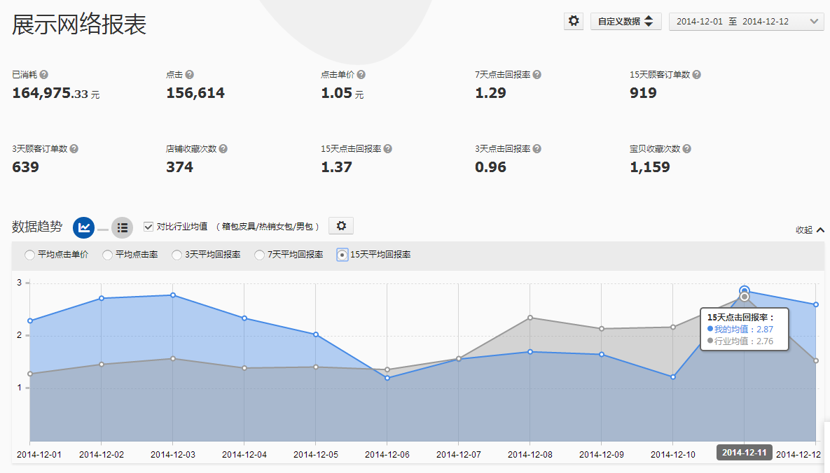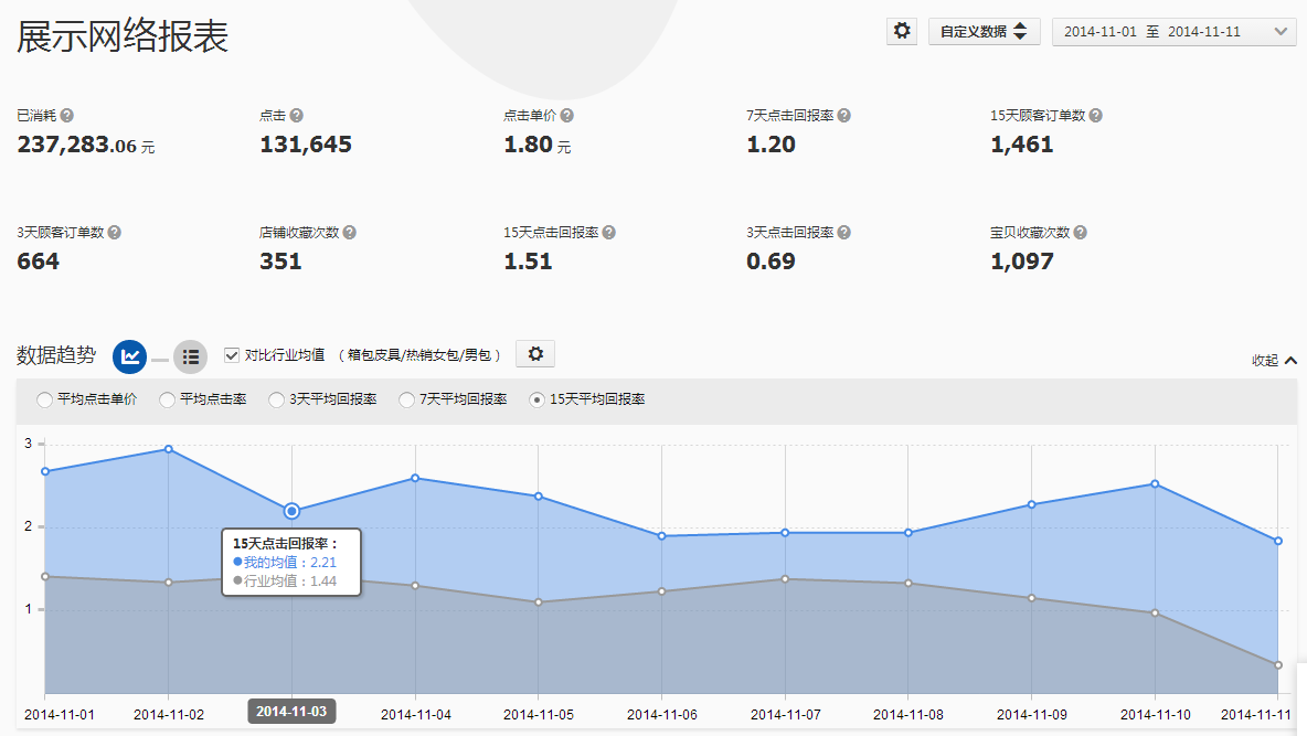 通過2014年雙11的曲線圖可以看到,從11月1日到11月11日,行業(yè)的平均ROI最高值出現(xiàn)在11月3日,只有1.44,而雙11當天的ROI只有0.35,是最低的一天,主要是因為點擊單價太高導(dǎo)致的,雙11當天行業(yè)的平均點擊單價為4.04元。