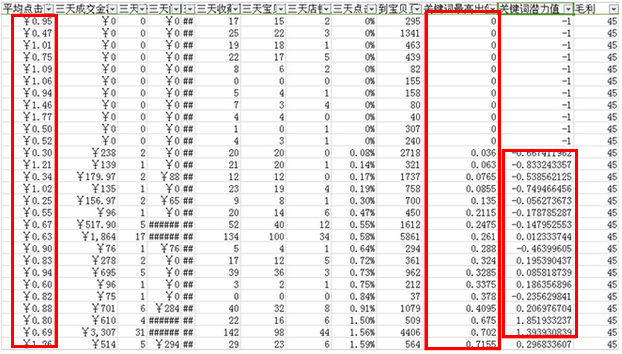 通過量子后臺(tái)下載關(guān)鍵詞報(bào)表:  使用公式:PPC高出價(jià)=轉(zhuǎn)化率單品毛利潤;關(guān)鍵詞潛力值=(產(chǎn)出-花費(fèi))/花費(fèi);進(jìn)行篩選,潛力值高的,重點(diǎn)優(yōu)化,高于最高點(diǎn)擊單價(jià)的關(guān)鍵詞,重點(diǎn)降低PPC。  將最高出價(jià)降序排列,遠(yuǎn)遠(yuǎn)低于平均點(diǎn)擊出價(jià)的關(guān)鍵詞,很難實(shí)現(xiàn)優(yōu)化效果的關(guān)鍵詞,可以果斷刪除。  對(duì)于已經(jīng)優(yōu)化到瓶頸的關(guān)鍵詞,我們可以刪除,保留在EXCEL里面,然后重新建立一個(gè)計(jì)劃,區(qū)域時(shí)段,都和老計(jì)劃一樣,將這些詞重新優(yōu)化起來,這樣關(guān)鍵詞的PPC就反向的降低下來了。  PPC最高出價(jià)=2.23%45=1.035>實(shí)際PPC:0.88