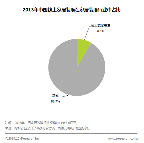 雖然過(guò)去幾年增長(zhǎng)速度較快,線上家居裝潢市場(chǎng)在行業(yè)中的整體占比仍然不高,根據(jù)艾瑞咨詢(xún)統(tǒng)計(jì),2013年我國(guó)線上家居裝潢行業(yè)交易額規(guī)模在955.1億元,占行業(yè)整體規(guī)模比例為8.3%。