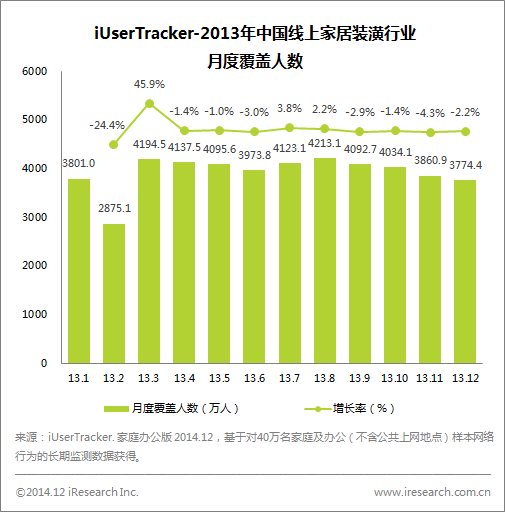 根據(jù)艾瑞iUserTracker數(shù)據(jù),2013年中國(guó)線上家居裝潢行業(yè)的月度覆蓋人數(shù)平均為3931.3萬(wàn)人,總體波動(dòng)不大,其中2月份為低谷,可能與春節(jié)期間裝修活動(dòng)停滯有關(guān)。