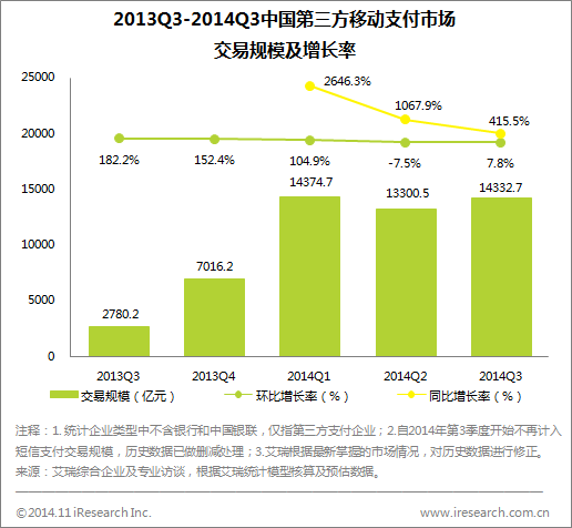 2014Q3第三方移動支付交易規(guī)模為14332.7億元
