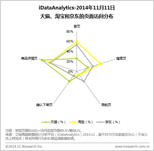 比較11月11日天貓、淘寶和京東訪客訪問各類頁面的覆蓋人數(shù)占比,可以看出三站訪客的訪問行為各有側(cè)重:天貓?jiān)L客對(duì)首頁和導(dǎo)航頁的訪問低于京東的53.2%和24.5%。由于淘寶與天貓的訪問互動(dòng),在淘寶搜索商品,可以搜到淘寶小商家和天貓店,所以三站之中,淘寶訪客對(duì)搜索功能的使用率最高,每?jī)扇酥芯陀幸蝗嗽L問了搜索結(jié)果頁面,京東和天貓使用搜索的訪客在全站的占比則分別為1/3和1/4。然而,不管是導(dǎo)航還是搜索,電商網(wǎng)站最終都是希望訪客能進(jìn)入商品詳情頁并完成下單,這么說來,“雙十一”的最大贏家就是天貓,其73.6%的用戶會(huì)訪問商品詳情頁,淘寶和京東的這一比例則均在六成左右;相應(yīng)的,天貓的下單頁面訪客占比也高達(dá)全站的1/4,超過淘寶和天貓?jiān)撜急鹊膬杀队杏唷?/p>