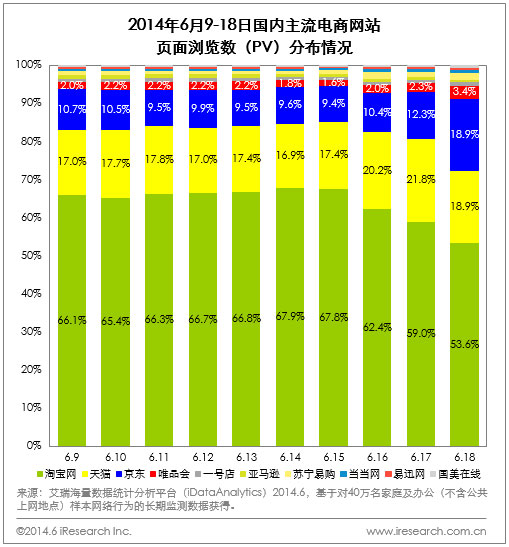 6月18日,從網購用戶在幾大主流電商平臺的瀏覽頁面數(shù)分布情況來看,京東頁面瀏覽數(shù)占比(PV占比)從日常的10%左右驟增到18.9%,幾近翻倍;而同時進行促銷大戰(zhàn)的其他幾家電商也都有一定程度的提升,其中唯品會PV占比從2.1%增加到3.4%,蘇寧從1.0%到1.8%,國美在線從0.3%到0.6%。而與不受大促影響的6月初相比,6月18號淘寶的PV占比下降了12個百分點,整體而言,B2C促銷力度加大,其頁面瀏覽數(shù)的增長相對更加快速,其增加的PV份額在一定程度上擠占了C2C的淘寶小商家的流量空間,用戶關注行為有部分轉移。