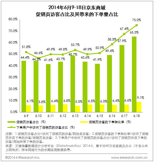 京東6·18大促的成功,其促銷頁面扮演了相當重要的角色。從數(shù)據(jù)上來看,6月18號的訂單中,75%的下單用戶都訪問了促銷頁。究其原因主要有兩點:一方面,促銷期間京東布置了很多促銷頁面,并借助于廣告和折扣吸引了大量的關注度,18號當天,訪問了京東促銷頁面的訪客超過了京東全站訪客的65%;另一方面,得益于促銷產品契合了目標用戶的需求和良好的頁面體驗等原因,促銷頁的訪客中有下單的訪客占比也明顯提升,其轉化率從6.6%增加到9.1%。