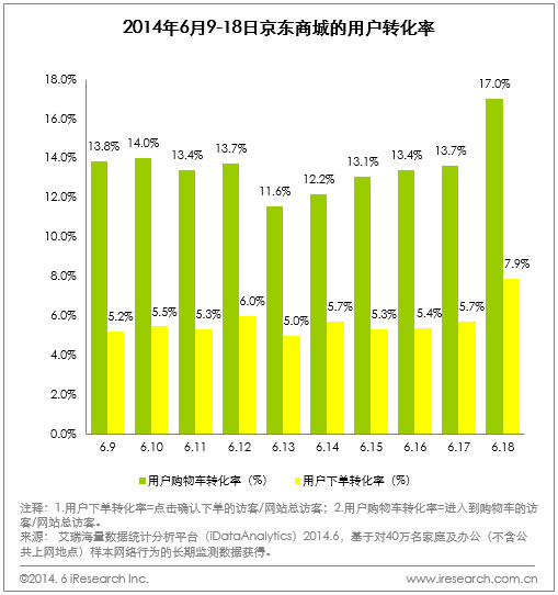 6月18日,京東流量大增的同時,用戶的轉化率也有明顯提升:購物車轉化率增至17.0%,而下單轉化率增至7.9%,也就是說,每100個訪客中,會有17個人訪問購物車,而8人最后下單成功;環(huán)比17號,增幅分別為24.9%和38.5%。京東商城的轉化率能在流量激增的促銷日不降反升,可以想見,經過幾年的6·18及雙十一等大促的積累,無論是從媒體的分眾廣告,還是產品的鋪設展示,京東都能越發(fā)地接近目標用戶和他們的需求,而6·18店慶也在網購群體中形成了一定的口碑積累。