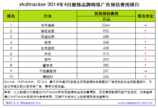 iResearch艾瑞咨詢根據(jù)網(wǎng)絡(luò)廣告監(jiān)測系統(tǒng)iAdTracker的最新數(shù)據(jù)研究發(fā)現(xiàn),2014年4月,服飾品牌網(wǎng)絡(luò)廣告總投放費用達1.1億元。其中,馬可維奇投放費用達2264萬元,位居第一;駱駝世家投放費用達920萬元,位居第二;阿迪達斯投放費用達688萬元,位居第三。