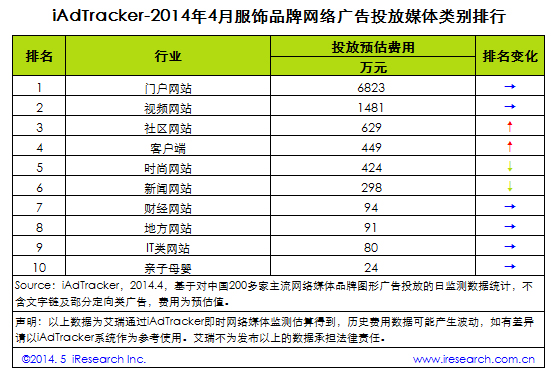 艾瑞iAdTracker最新數(shù)據(jù)顯示,2014年4月,門戶網(wǎng)站和視頻網(wǎng)站是服飾類品牌網(wǎng)絡(luò)廣告主首選的投放媒體。其中,門戶網(wǎng)站投放費用達6823萬元,占總投放費用的64.8%;視頻網(wǎng)站投放費用達1481萬元,占總投放費用的14.1%,兩者合計占總投放費用的78.9%。
