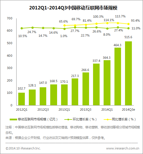艾瑞咨詢數(shù)據(jù)顯示,2014年第三季度中國移動互聯(lián)網(wǎng)市場規(guī)模達到515.6億元,環(huán)比增長11.0%,同比增長93.4%。