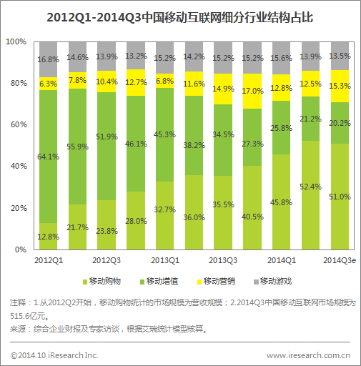 艾瑞咨詢數(shù)據(jù)顯示,2014年第三季度移動購物占比達到51.0%,移動增值占比為20.2%,移動營銷占比15.3%,移動游戲占比13.5%。移動購物占據(jù)移動互聯(lián)網(wǎng)經(jīng)濟半壁江山;移動增值進一步受到其他細分領(lǐng)域的排擠,占比持續(xù)降低;由于移動廣告平臺開始出現(xiàn)分化,程序化購買產(chǎn)業(yè)鏈初步形成,新的移動廣告投放方式刺激移動營銷市場實現(xiàn)新的增長。