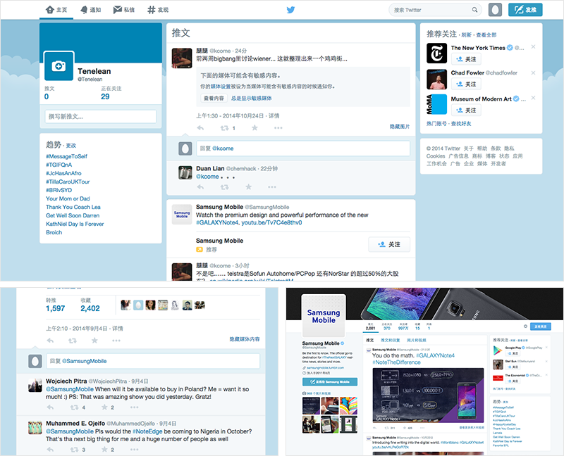 整體藍(lán)色設(shè)計(jì)帶來(lái)統(tǒng)一印象,顏色的深淺分別承載不同類型的內(nèi)容信息,比如信息內(nèi)容模塊,白色底代表用戶內(nèi)容,淺藍(lán)色底代表回復(fù)內(nèi)容,更深一點(diǎn)的藍(lán)色底代表可回復(fù)操作,顏色主導(dǎo)著信息層次,也保持了twitter的品牌形象。
