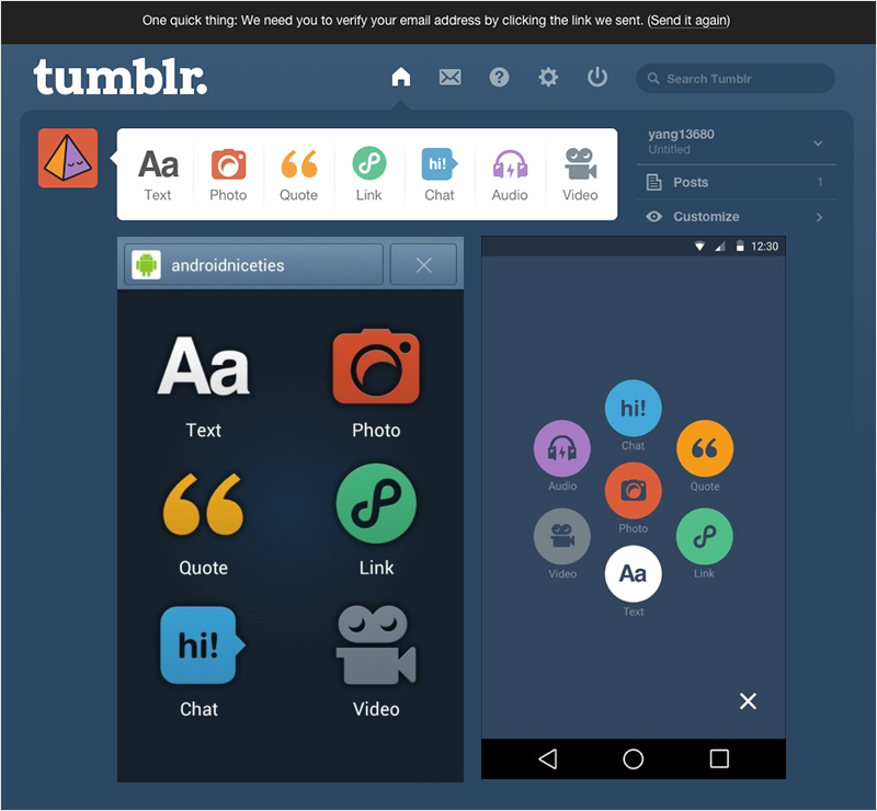 在實(shí)際的設(shè)計(jì)運(yùn)用中,常會(huì)用些更綜合的手法,例如整體有主導(dǎo)色調(diào),小范圍布局會(huì)采用同色調(diào)搭配。拿tumblr的發(fā)布模塊來(lái)說(shuō),雖然頁(yè)面有自己的主色調(diào),但小模塊使用同色調(diào)不同色彩的功能按鈕,結(jié)合色相變化和圖形表達(dá)不同的功能點(diǎn),眾多的按鈕放在一起,由于同色調(diào)原因模塊非常穩(wěn)定統(tǒng)一。