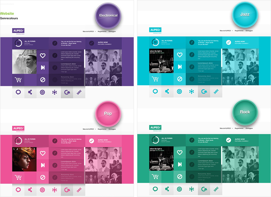 拿紫色界面來(lái)說(shuō),利用同一色相通過(guò)色調(diào)深淺對(duì)比,營(yíng)造頁(yè)面空間層次。雖然色彩深淺搭配合理,但有些難以區(qū)分主次,由于是同一色相搭配,顏色的特性決定著心理感受。