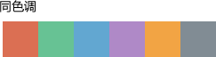 這是由同一或類似色調(diào)中的色相變化構(gòu)成的配色類型,與主導(dǎo)色調(diào)配色中的屬于同類技法。區(qū)別在于色調(diào)分布平均,沒有過(guò)深或過(guò)淺的模塊,色調(diào)范圍更為嚴(yán)格。