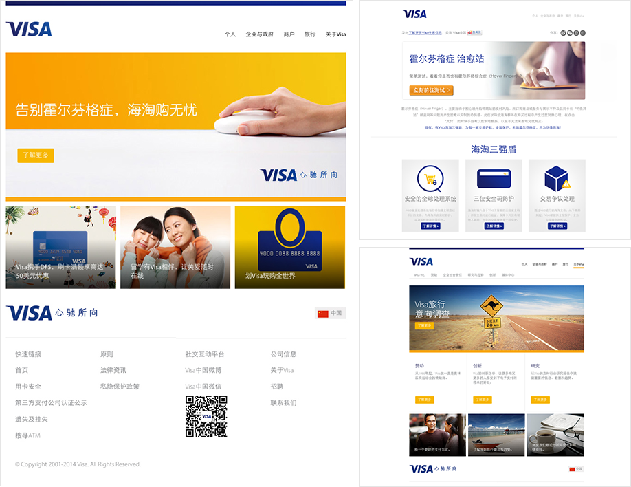 VISA是一個(gè)信用卡品牌,深藍(lán)色傳達(dá)和平安全的品牌形象,黃色能讓用戶產(chǎn)生興奮幸福感。另外藍(lán)色降低明度后再和黃色搭配,對(duì)比鮮明之余還能緩和視覺疲勞。