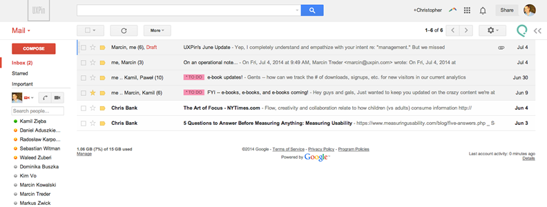 Gmai就是單頁應用的一個很好的例子,其將多項操作融入了一個單獨的“頁面”中。單頁設計的趨勢是這一UI模式中相對不太高端的一種實現(xiàn)方式,在這一設計模式下,所有內(nèi)容均可通過同一頁面訪問。這一模式可以讓瀏覽變得更快、響應更迅速,從而讓桌面與web應用之間的界限不再如此分明。