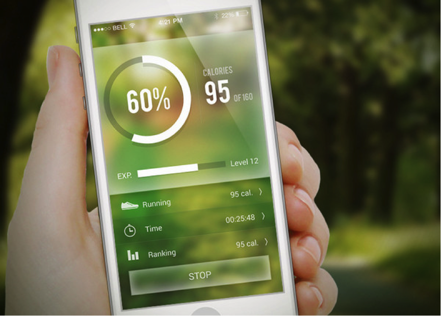 下面是一個健身應(yīng)用程序,是呈現(xiàn)半透明玻璃質(zhì)感的圖層和友好控件組合都覆蓋到模糊的背景上的方案,其中綠色景觀的情景增加了一些自然設(shè)計因素。