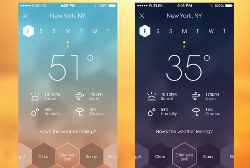 天氣應(yīng)用!由 Fueled設(shè)計的,經(jīng)過反復(fù)推敲,無不散發(fā)著精致和匠心的應(yīng)用界面。它有2個設(shè)計上的創(chuàng)新:利用模糊背景進行巧妙、有效地內(nèi)容詮釋,超窄型字體與輪廓圖形設(shè)計的非常匹配。