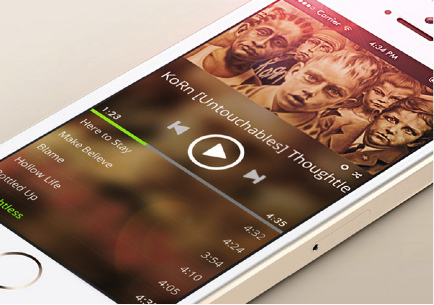 接下來是iOS 7的音樂應(yīng)用,這個方案里有個小而美的CD圖像,很適合放在這里。后面大面積暖色調(diào)的模糊背景為音樂播放器和控件組,提供了良好的氛圍。