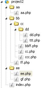 看我們的實驗圖,在圖中項目下分別有aa bb ee 三個同級目錄和一個index.php文件,在bb下又有cc目錄,cc下又有dd目錄和cc.php ccc.php兩個文件,同樣dd下也包含一個dd.php文件。凡是上層對下層均屬上級引用.