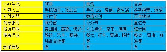 綜上所述,BAT在O2O領(lǐng)域布局的共同邏輯都是基于海量移動用戶,以各自核心產(chǎn)品為基點,建立起不同的生活使用場景,形成從一個完整的O2O生態(tài)系統(tǒng)。不同的是,有人占據(jù)地利,卻未必擁有人和,BAT三巨頭在O2O領(lǐng)域至今沒有更大的建樹。
