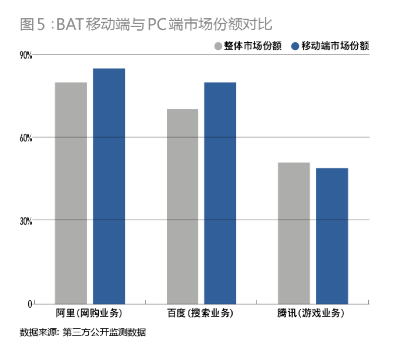 再從各自移動(dòng)端市場地位的橫向?qū)Ρ葋砜?,BAT各自的核心業(yè)務(wù)在移動(dòng)端的市場占有率,基本延續(xù)了其在PC端的霸主地位(圖5)。