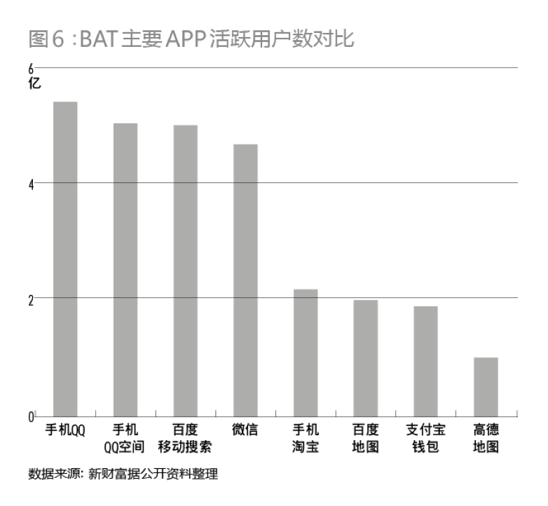 BAT麾下各自的主要移動(dòng)端APP中,百度移動(dòng)搜索的活躍用戶數(shù)量悄悄地趕了上來,達(dá)到了能與騰訊旗下手機(jī)QQ、微信相匹敵的5億活躍用戶量,而阿里旗下無論是手機(jī)淘寶還是支付寶錢包,活躍用戶量皆與騰訊相差甚遠(yuǎn)(圖6)。