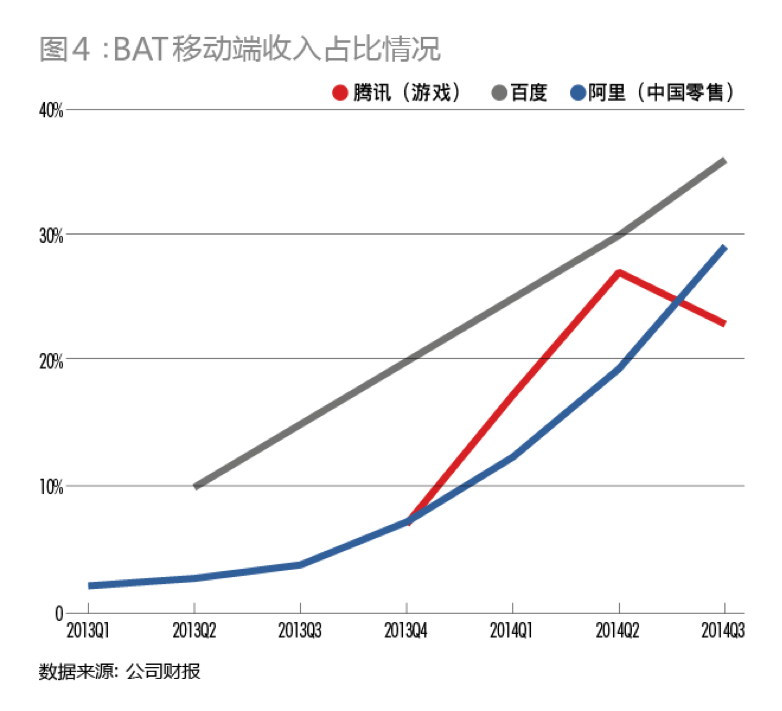 2014年第三季度,百度移動(dòng)端創(chuàng)造了48.6億元收入,占其總收入的36%;阿里的中國零售業(yè)務(wù)(天貓+淘寶)在移動(dòng)端獲得了37.19億元收入,占其中國零售業(yè)務(wù)總收入的29%;騰訊游戲從移動(dòng)端獲得了26億元營收,占其游戲業(yè)務(wù)總收入的23%。