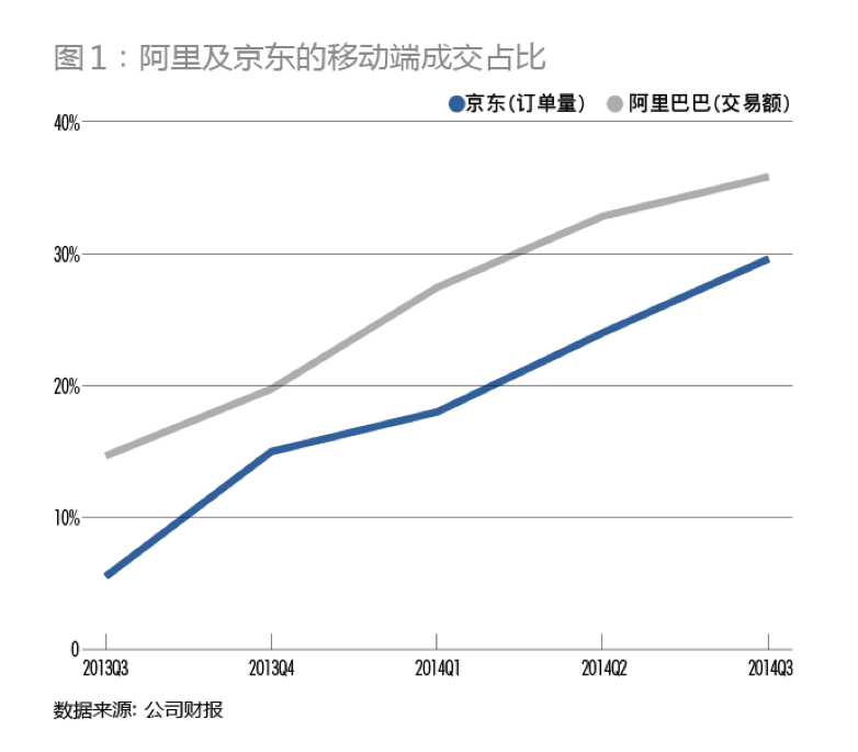 從最近5個(gè)季度的電商移動(dòng)端成交占比情況來看,阿里始終高出京東一截。阿里的移動(dòng)端成交占比,從2013年第三季度的14.67%,增長到2014年第三季度的35.82%;而京東的移動(dòng)端成交占比,從2013年第三季度的5.54%,增長到2014年第三季度的29.6%(圖1)。