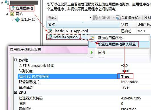 方法一:“設(shè)置應用程序池默認屬性”/“常規(guī)”/”啟用32位應用程序”,設(shè)置為 true。 如下圖所示: