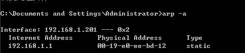 192.168.1.1為arp -a之后 Internet Address欄目的  00-19-e0-ee-bd-12為  Physical Address 欄目的