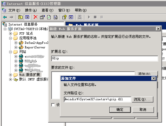 2. 新增一個(gè)服務(wù)擴(kuò)展,路徑為 "%windir%\System32\inetsrv\gzip.dll"。添加完成后,允許該擴(kuò)展使用。