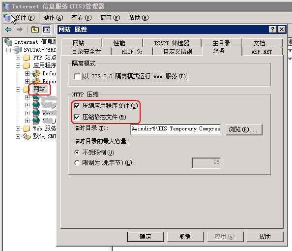 1. 在 "IIS 管理器" 中,打開 "網(wǎng)站 >屬性" 對話框,切換到 "服務(wù)" 頁卡,選中兩個(gè)壓縮選項(xiàng)。