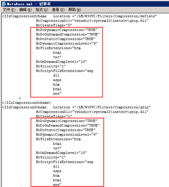 4.用記事本打開 "%windir%\system32\inetsrv\MetaBase.xml",找到 "IIsCompressionScheme",按下述方法修改、保存。(建議修改前先做備份)