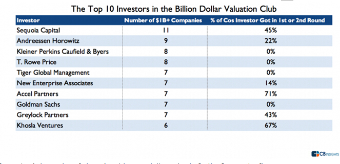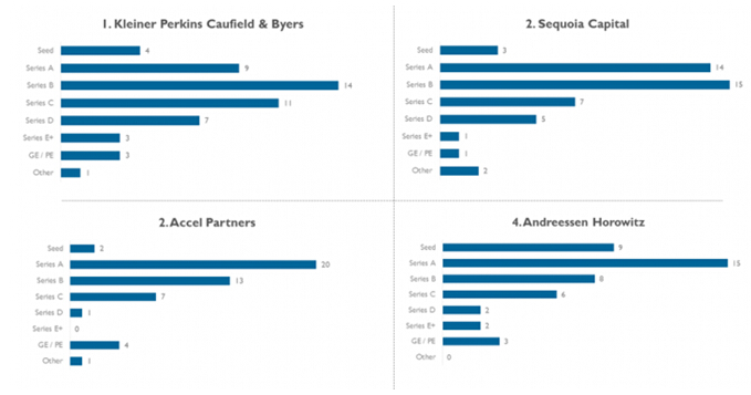 根據(jù)風(fēng)投公司所投資的具有上市潛力的創(chuàng)業(yè)公司數(shù)量——CBInsights把公司的估值作為是否具有上市潛力的衡量標(biāo)準(zhǔn)——排在前三位的風(fēng)投公司分別是KPCB風(fēng)投公司(Kleiner Perkins Caufield & Byers),紅杉資本(Sequoia Capital)和Accel Partners。但是這三家風(fēng)投公司各有側(cè)重點(diǎn):KPCB風(fēng)投公司習(xí)慣在中間階段開始投資,而Andreessen Horowitz的投資集中在種子投資和A輪投資。紅杉資本和Accel Partners則更多地參與創(chuàng)業(yè)公司的A輪投資。